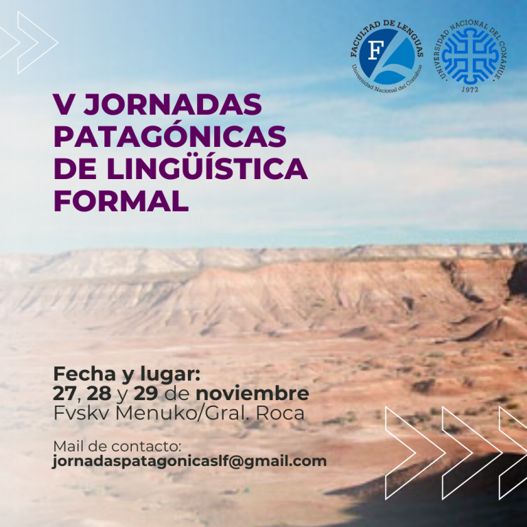 Con mucha alegría, anunciamos una nueva edición de nuestras jornadas Se vienen las V Jornadas Patagónicas de Lingüística Formal 2025 27 al 29 de noviembre Fvskv Menuko/Gral. Roca Facultad de Lenguas, UNComahue (Res. CD